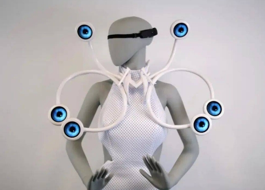 作為一款嵌入屏幕的、可實時大腦監(jiān)控的3D打印連衣裙,在穿衣者與周圍環(huán)境之間創(chuàng)造了一種以技術為媒介的對話。時尚成為一種新型的相互聯(lián)系,由穿著者大腦的潛意識信號控制。這些信號是使用新型尖端腦電圖傳感器拾取的,該傳感器形成了可穿戴腦機接口。該界面使用機器學習來確定佩戴者的腦力負荷。然后,工作量會實時反映在裙子雕刻領口的六個圓形顯示屏上。